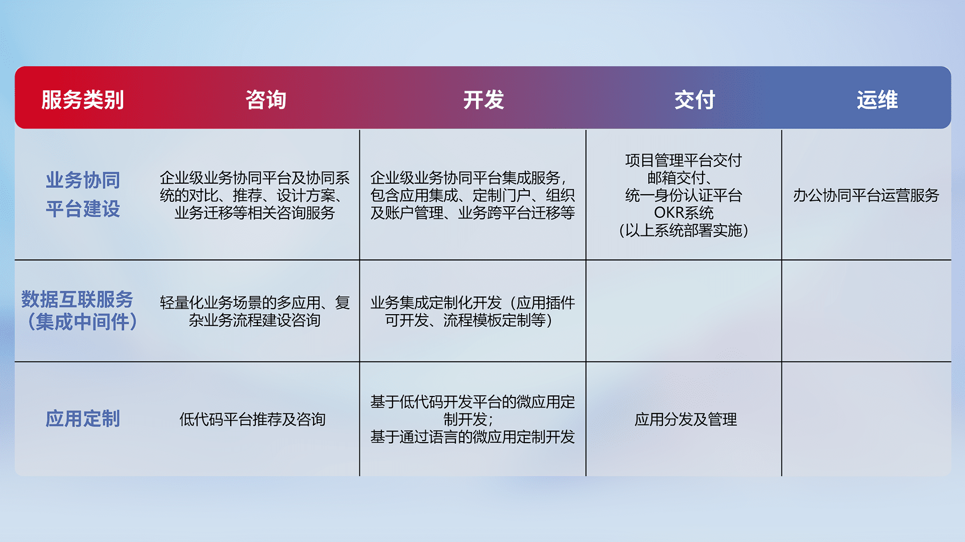 针对钉钉、、企微、、、、IDaas等平台级产品提供产品的规划、、、方案、、、交付、、定制化开发等服务,,,,实现如统一协同办公、、、智能客户服务、、、、混合会议管理、、、智能数据查询、、等业务场景,,,实现数字化转型。。。